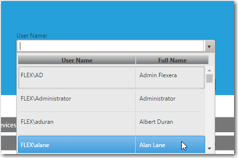 - Switching to a different user of the same device—If you enter a device or user name, a device along with an associated user is added to the Selected list. If you want to select that device but with a different assigned user, click the user icon in the Action column. A user name selection dialog box opens.